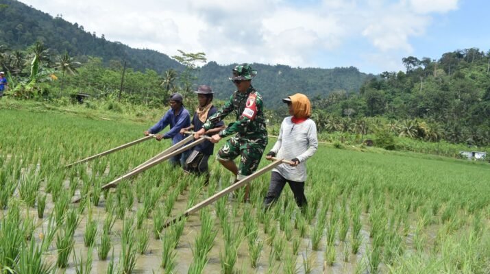 Dansatgas TMMD Ke-126 Kodim 0818/Malang-Batu, Letkol Czi Bayu Nugroho, bersama petani melakukan kegiatan matun pembersihan gulma padi secara tradisional di lahan sawah Desa Lebakharjo Kecamatan Ampelgading Kabupaten Malang.(10/2025)