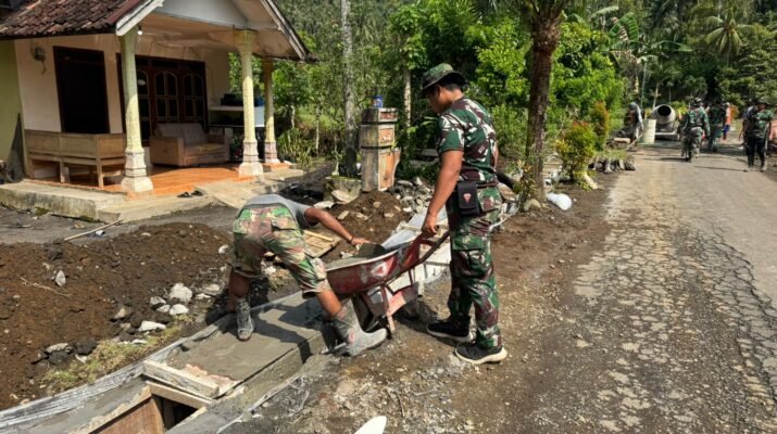 Di tengah tingginya intensitas hujan yang melanda wilayah Kecamatan Ampelgading, Kabupaten Malang, Satgas TNI Manunggal Membangun Desa (TMMD) ke-126 Kodim 0818/Malang-Batu terus menunjukkan semangat