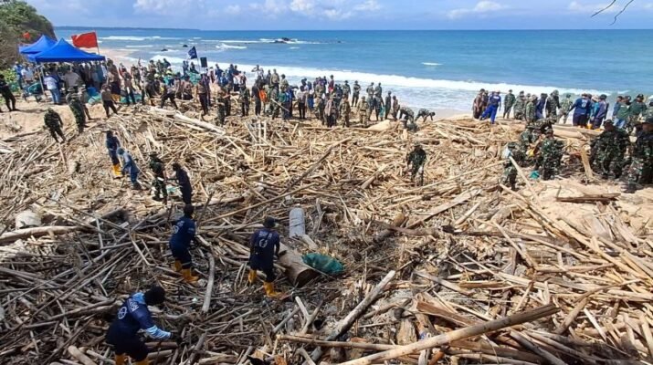 Bukan sekadar memungut sampah plastik, para relawan ini mengandalkan kekuatan gotong royong yang luar biasa untuk mengevakuasi batang-batang pohon raksasa yang terdampar di sepanjang garis pantai.